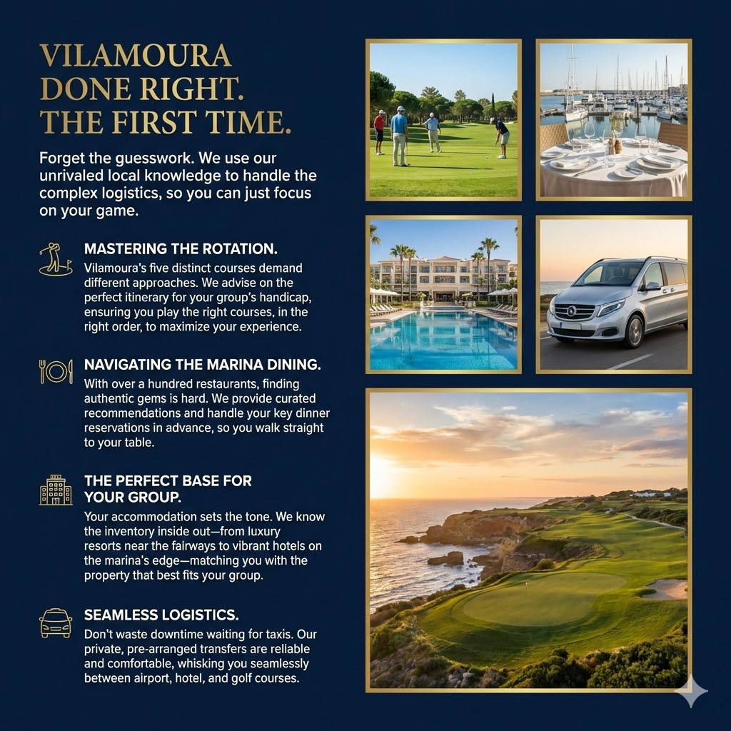 Forget the 6-month booking window. Our direct relationships with the Details collection and hotels like the Hyatt Regency Vilamoura and Hilton Vilamoura mean we secure prime morning tee times when others can’t.